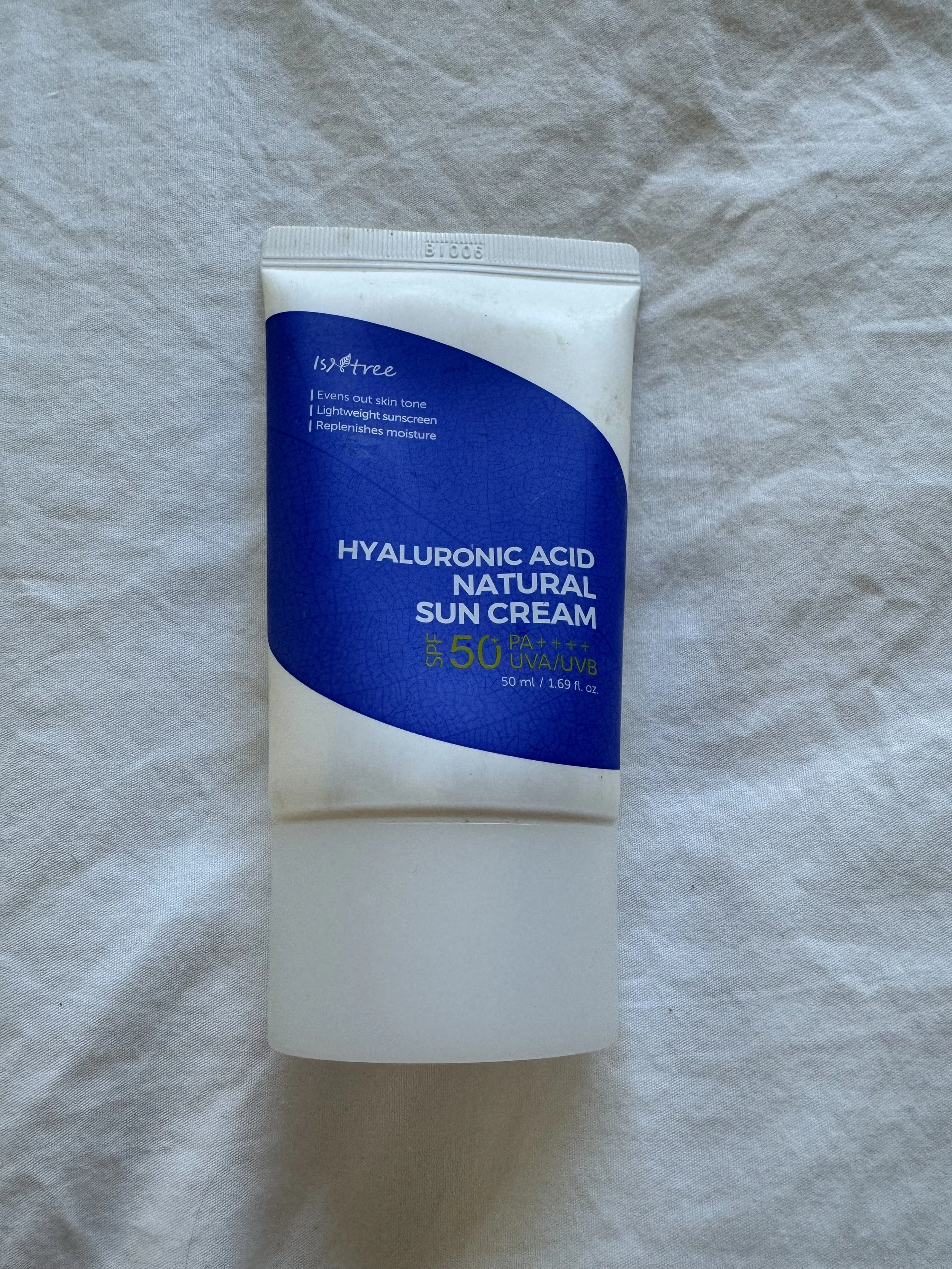The Isntree Hyaluronic Acid Natural Sun Cream, is a Korean skincare product. Because it contains hyaluronic acid, it not only is it protecting you from the sun, but it’s also keeping your skin really hydrated without that greasy feeling.